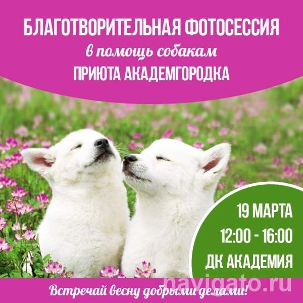 19 марта возле ДК Академия с 12.00 до 16.00 пройдет фотосессия с животными. Каждая фотография стоит 100 рублей - средства будут перечислены собачьему приюту Академгородка.