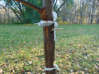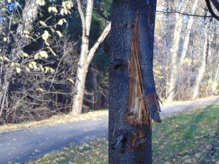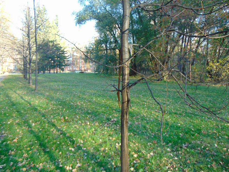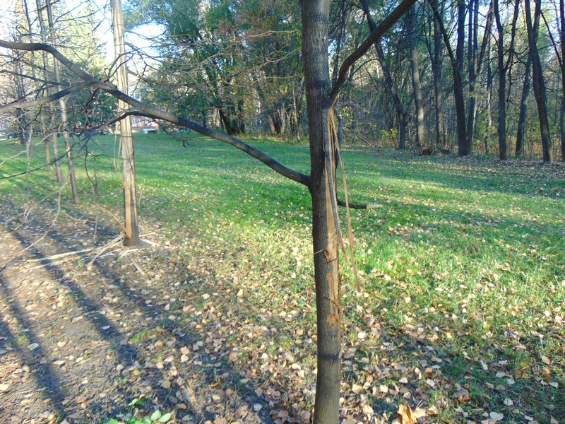 Сегодня наш корреспондент выехал на место и убедился, что из 16 деревьев половина повреждены. У одних кора только поцарапана, у других висит длинными полосами, кое-где сломаны ветви. Такое случилось, видимо, не в первый раз: на одном из деревьев кора, уже засохшая, примотана полиэтиленовыми лентами к стволу (кто-то пытался подлечить липу), но, увы, кора не приросла, топорщится, создавая рассадник для насекомых-вредителей.