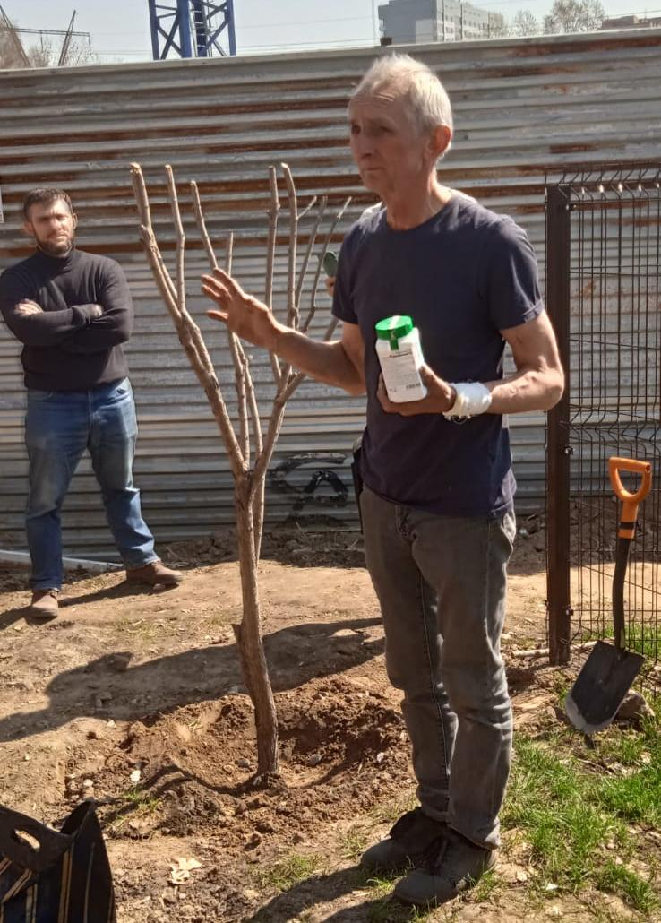 Руководил посадкой главный специалист группы ландшафтной архитектуры и фитодизайна Центрального сибирского ботанического сада СО РАН Юрий Овчинников. Всем участникам достаётся по одному-два «ребёнка», взятых от огромной шаровидной ивы, росшей возле магазина «Эрнест». Зимой ее пришлось срубить: дерево попало в зону строительства дома. Пришедших на субботник удивило, что им предложили саженцы без корней, то есть попросту палки.