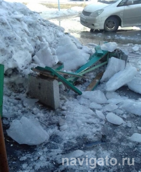 Глыба льда, упавшая с крыши дома разнесла на куски лавку у трехэтажного дома в Бердске. Происшествие случилось вчера, 29 марта, у дома №32 на территории бывшего Бердского санатория.
