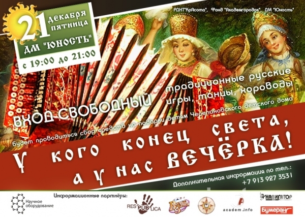- Организаторы мероприятия – Русский дом народных традиций «КрАсота», общественный фонд «Академгородок» и Дом молодёжи «Юность». Вход на вечёрку свободный, но будет проводиться сбор средств на подарки детям из Черепановского детского дома.