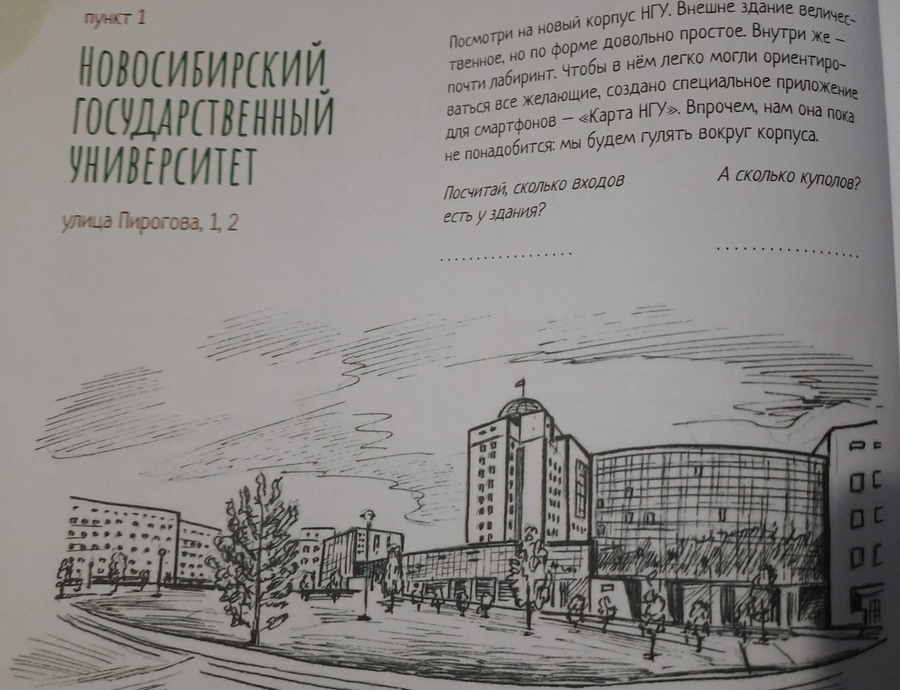 От персоналий автор переходит к знаковым местам Академгородка. Этот раздел интерактивный. Сначала надо прочесть маленький рассказ о достопримечательности, а затем ответить на вопросы, нарисовать картинки или приклеить иллюстрации. Например, написать, каким животным поставлены памятники возле Института цитологии и генетики СО РАН. А ещё юным читателям предлагают немного помечтать о будущем: допустим, рассказать, каким они хотят видеть Дом культуры «Академия».