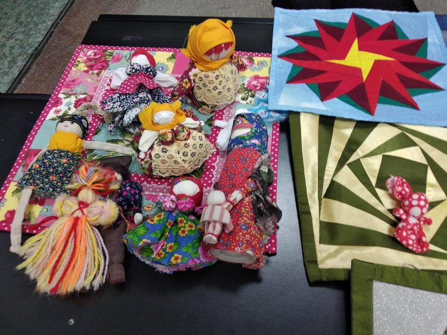 На презентации были представлены не только изделия, выполненные в техниках «узоры», «крейзи» (сумасшедший лоскуток»), но и куклы: русская народная тряпичная кукла, подорожница, травница, зерновушка, пеленалка, мальчик-куклак, веснянка, мамина помощница. Все они имеют свое предназначение.