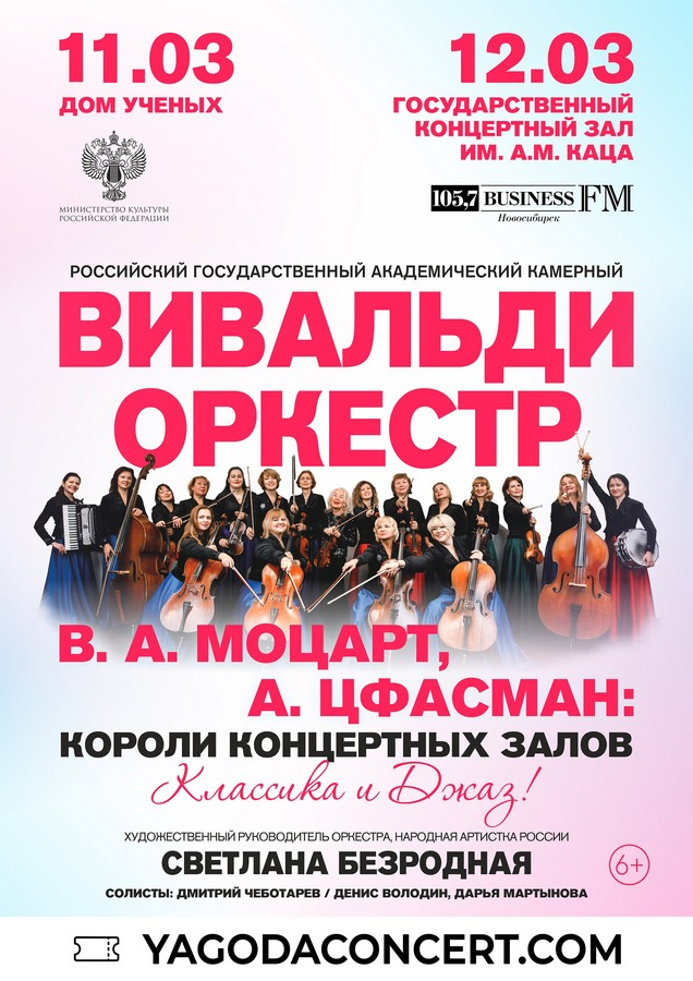 Российский государственный академический камерный «Вивальди-оркестр» под управлением народной артистки России Светланы Безродной выступит в Новосибирске. Коллектив приезжает с новой программой классики и джаза «Виртуозы разных эпох. В.А. Моцарт, А. Цфасман – короли концертных залов» (6+).
