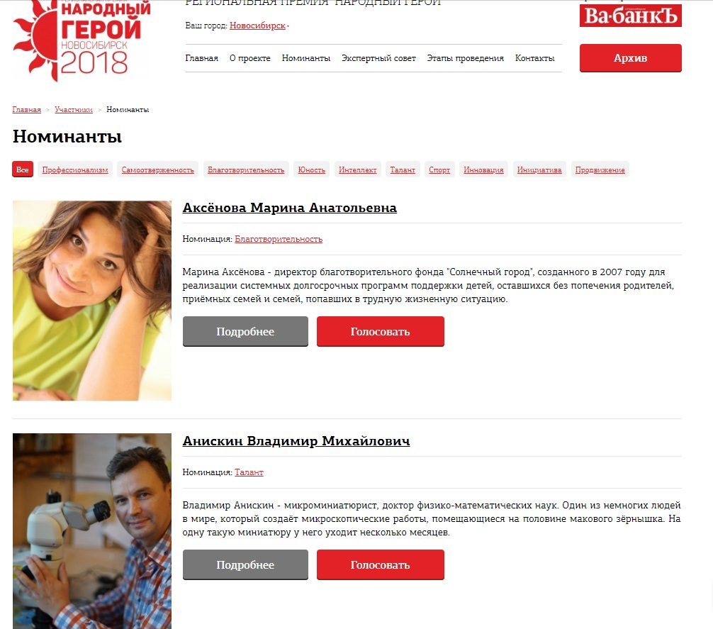 В настоящее время в Новосибирске завершен первый этап (сбор заявок) региональной премии «Народный герой». Экспертный совет, в который входят 15 известных новосибирцев, из 267 заявок выбрал 50. Кто из претендентов получит награду, решат жители Новосибирской области. В голосовании принимают участие по пять кандидатов в каждой номинации («Инициатива», «Спорт», «Талант», «Юность», «Продвижение», «Профессионализм»,«Интеллект», «Благотворительность», «Самоотверженность», «Инновация»).
