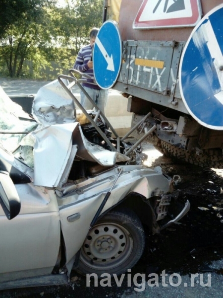Утром 4 сентября вазовскую «десятку» смяло в аварии со стоящим грузовиком дорожных служб на Бердском шоссе в Советском районе.