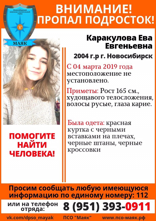 Поисковый отряд «Маяк» просит помощи в розыске и распространении информации о пропавшей несовершеннолетней Еве Каракуловой 2004 года рождения.