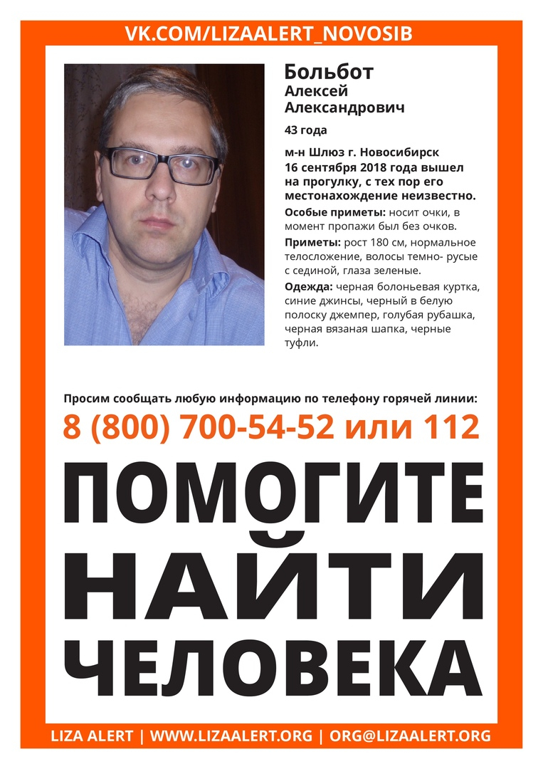 Поисковый отряд «Лиза Алерт Новосибирск» просит у новосибирцев помощи в поисках пропавшего в воскресенье (16 сентября) жителя Шлюза Алексея Александровича Больбота.