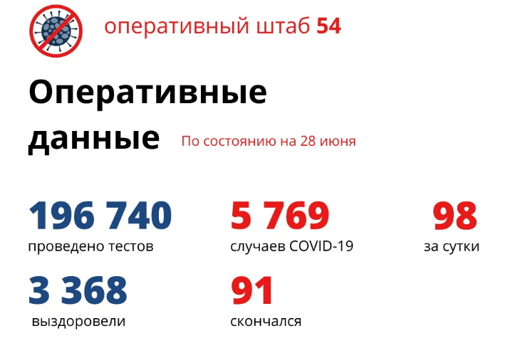 Как сообщают в оперативном штабе, на утро 28 июня в Новосибирской области зарегистрировано 5 769 случаев заражения коронавирусной инфекцией, в том числе 357 детей. За сутки заболели 98 человек, в том числе четверо делей. 3 368 пациентов выздоровели (+66 за сутки).