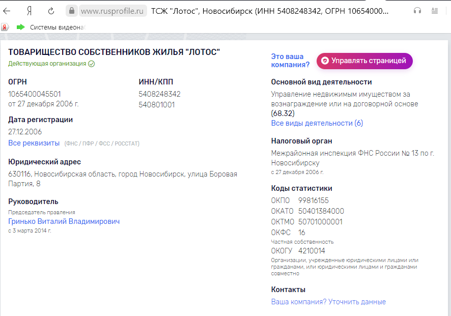 Согласно информации портала rusprofile.ru, ТСЖ «Лотос» зарегистрировано в конце декабря 2006 года. Его юридический адрес: ул. Боровая Партия, 8.