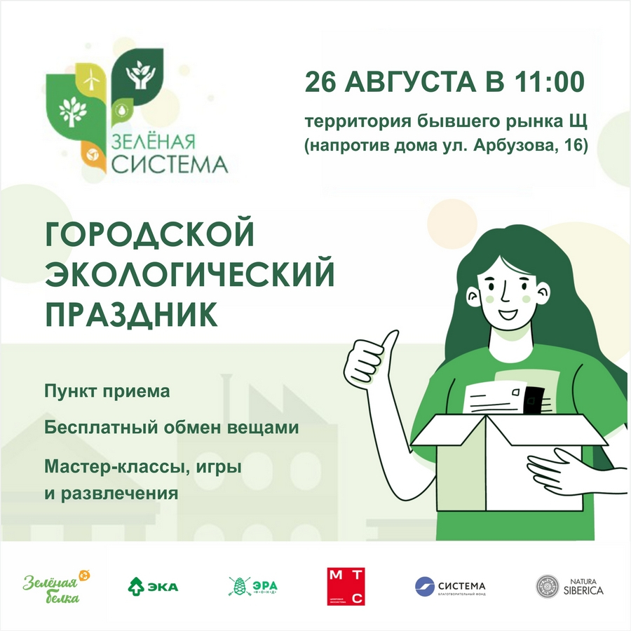 Экологический праздник «Зелёная система» (0+) организуют волонтёры. Проведут его на территории бывшего рынка Нижней зоны Академгородка (напротив дома по улице Арбузова, 16).