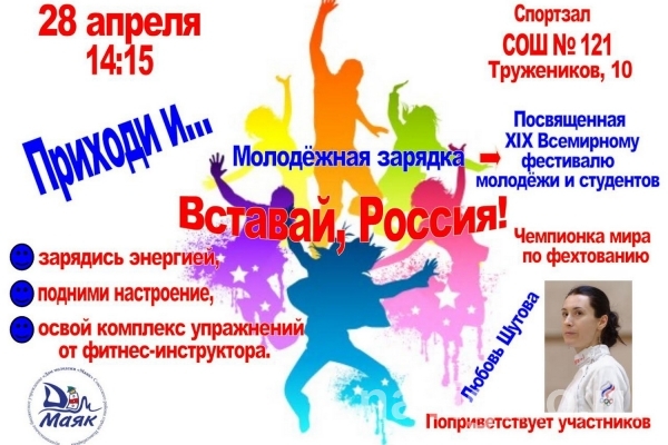 Приветствие Любови Шутовой, бронзового призера Олимпийских игр-2016 в командной шпаге, поможет проснуться ребятам после зимней спячки и серой хандры. Фитнес-инструктор Ника Кайгородова покажет комплекс упражнений для поддержания физического здоровья. Молодежная зарядка «Вставай, Россия!» проводится в честь XIX Всемирного фестиваля молодёжи и студентов.