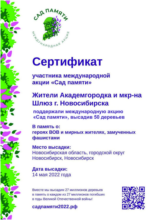 Общественный совет Шлюза уже получил сертификат международной акции «Сад памяти», место высадки отмечено на единой карте.