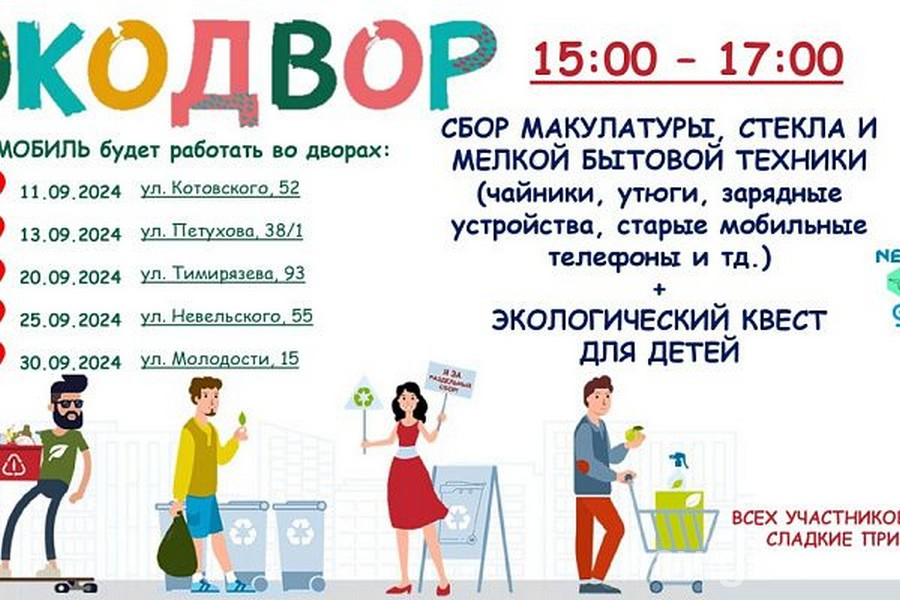 В сентябре экомобиль МУП «САХ» будет работать в пяти точках города, в том числе 30 сентября в м-не ОбьГЭС по адресу: ул. Молодости, 15. Здесь с 15.00 до 17.00 можно сдать вторсырьё: макулатуру, старые батарейки, стекло, сломанную бытовую технику.
