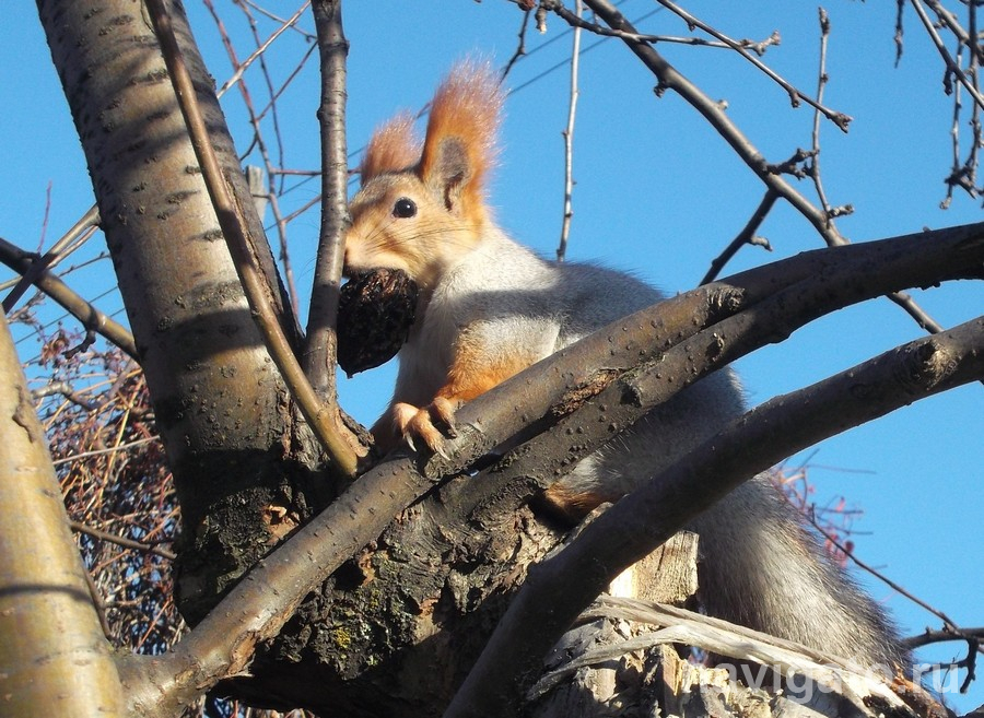 В этом году в лесочке между ул. Демакова и прудом вблизи Каинской Заимки белок больше обычного, и они не перестают удивлять своими причудами: то с ветки на ветки прыгают, будто физкультурой занимаются, то подерутся, прогоняя друг друга с занятой территории. А тут встретился зверёк, занимавшийся посадками дерева редкого у нас вида.