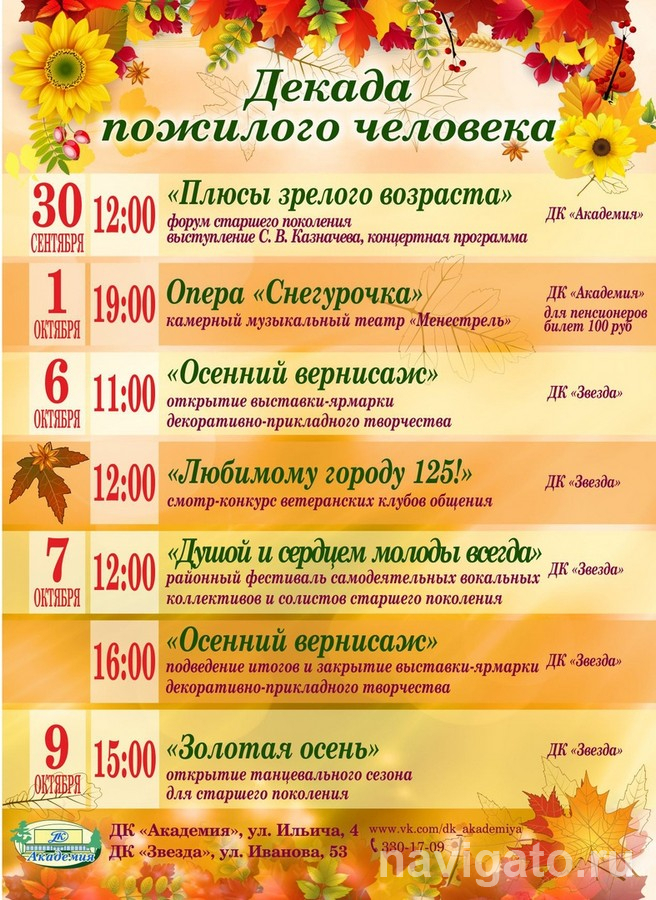 12.00 – форум старшего поколения «Плюсы зрелого возраста», посвящённый открытию Декады пожилого человека. Концертная программа (ДК «Академия», ул. Ильича, 4);