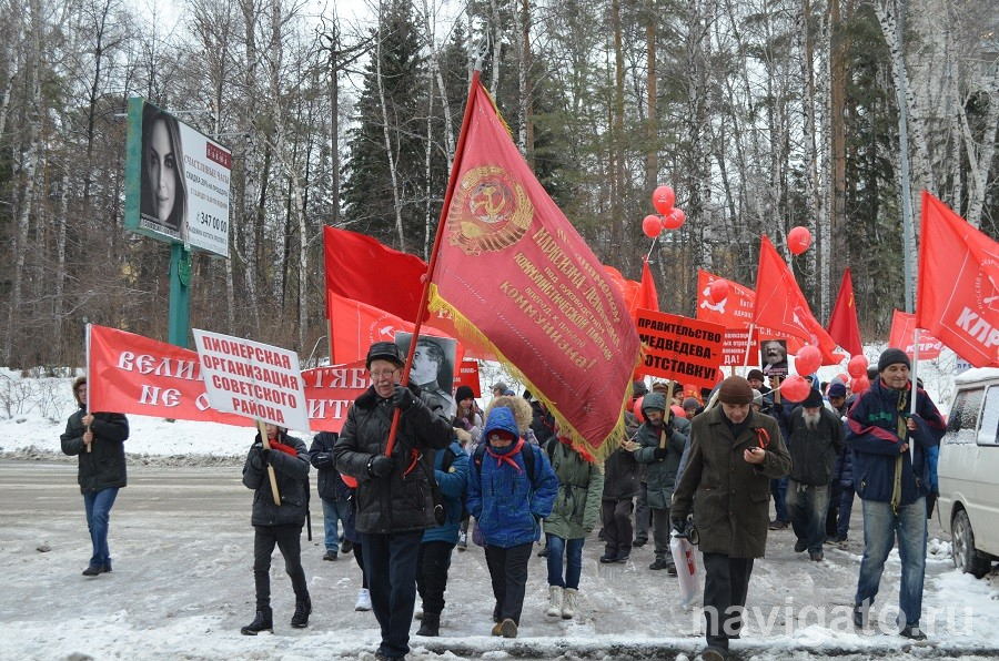 Из рупоров звучат песни советских времён, плечом к плечу идут взрослые и дети с плакатами и красными шарами, с портретами Ленина и Сталина... Так в Советском районе отмечали 101-ю годовщину Октября. 7 ноября в Академгородке прошли традиционные шествие и митинг коммунистов.