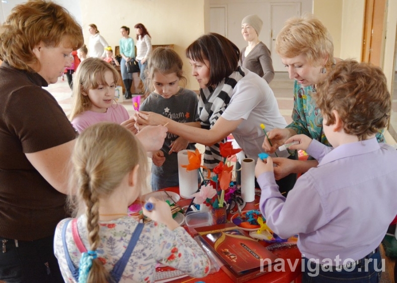 В просторном светлом фойе ДК «Звезда» звучала музыка, бегали шустрые малыши, любители рукоделия плели весенние цветы из бумаги, увлекаемые специалистами по социальной работе Ольгой Кулигиной, Мариной Козловой, Лидией Хохловой и Галиной Зозуляк, родители оживлённо общались с детьми и друг с другом.