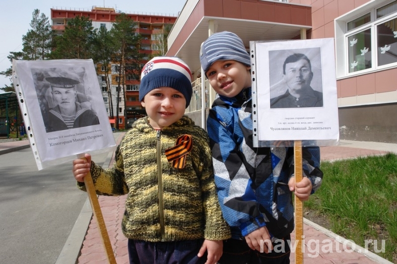 Вместе с родителями и воспитателем ребятишки приняли участие в митинге, который прошел на Шлюзе. Кроме того, с портретами своих героических прадедов в руках дети шли в колонне Бессмертного полка. На Аллее Славы юные участники шествия вручили ветеранам подарки, сделанные своими руками.