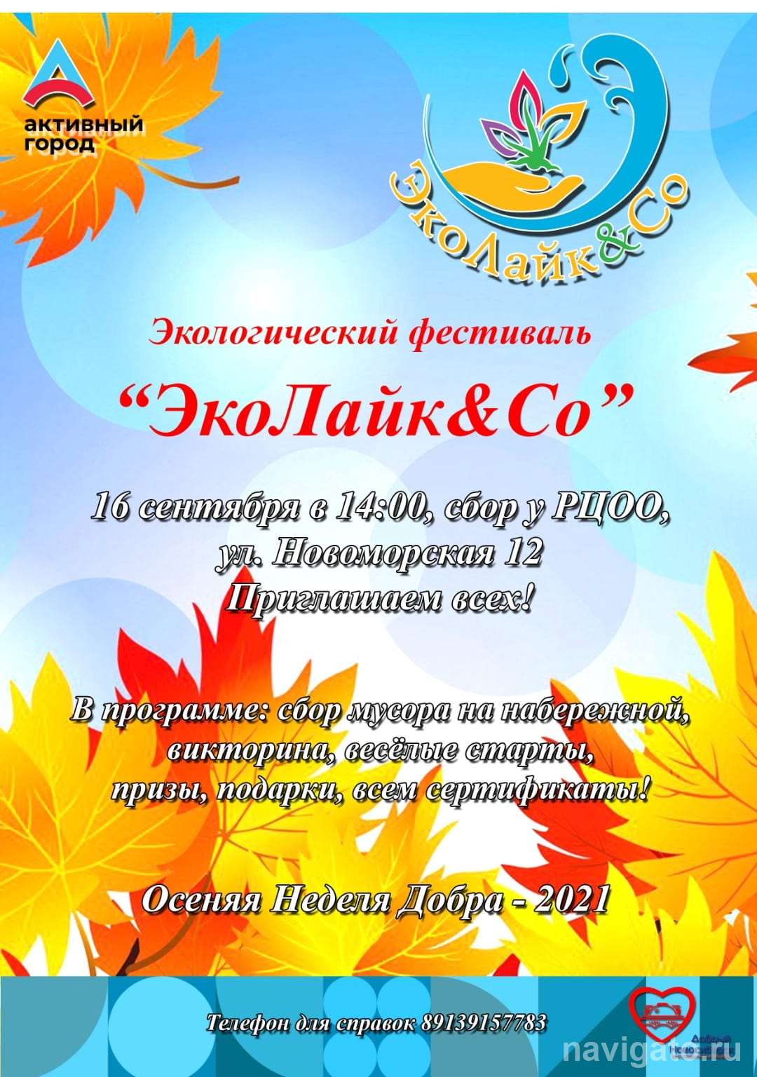 Так называется экологический фестиваль, который начнётся 16 сентября в 14.00 на набережной в м-не ОбьГЭС. Он пройдёт в рамках Осенней недели добра и благотворительного марафона «Добрый Новосибирск». После уборки берега гостей ждут эстафеты, розыгрыш лотереи, музыкальная программа. Каждый получит сертификат участника. Место сбора – РЦОО Советского района (ул. Новоморская, 12). Тел. 334-76-02, 8-913-915-77-83.