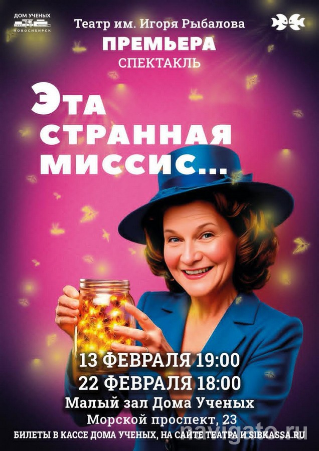 Театр имени Игоря Рыбалова – Театр Дома учёных – приглашает на премьеру по комедии американского автора Джона Патрика. Это юмористический детектив о добрых сумасшедших, спрятавшихся от нашего безумного мира в частной клинике. Но вдруг сюда, как метеорит, падает миссис Сэвидж!.. Приходите на спектакль 13 февраля в 19:00 или 22 февраля в 18:00 в Малый зал ДУ. Билеты в кассе и на сайте sibkassa.ru.