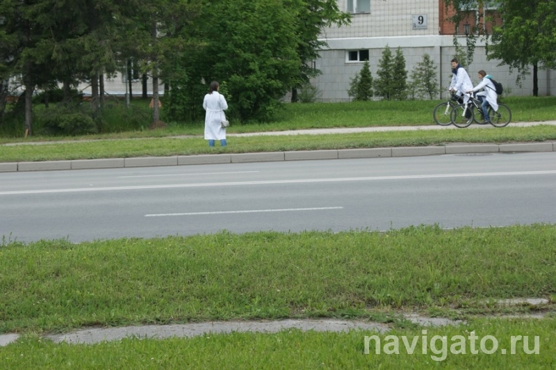 Молодые ученые в белых халатах выстроились на расстоянии примерно 50 метров друг от друга на велосипедной дорожке вдоль проспекта Академика Лаврентьева. Те, у кого были велосипеды, катались на них вдоль магистрали.