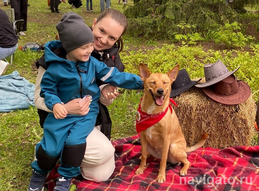 Светлана привела на съёмки Радугу, которая ещё два года назад была приютской собакой. Сегодня – любимица семьи и гостей праздника. Рыжая красавица доброжелательная, спокойно даёт себя погладить.