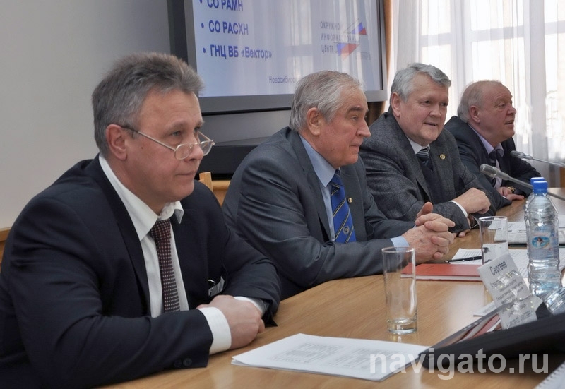 С журналистами встретились Александр Асеев, председатель Президиума СО РАН, Михаил Любарский, зампредседателя СО РАМН, Александр Донченко, председатель СО РАСХН, Александр Сергеев, гендиректор научного центра вирусологии и биотехнологии «Вектор».
