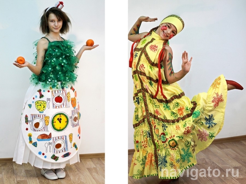 Люба Кузьмина придумала двусторонний костюм новогоднего стола до и после праздничного веселья. Ее мама специально приготовила зимний салат, чтобы дочка смогла его нарисовать во всех подробностях. Идеи же генерировали всей семьей, соревнуясь в оригинальности.