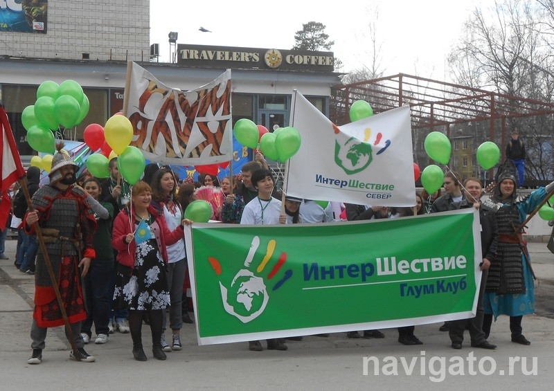 Начался праздник 25 апреля с интершествия – мероприятия, ставшего популярным еще во времена самых первых интернедель. Последние несколько лет шествия не проводились, а теперь традицию решено было возродить. Несмотря на пасмурный и не по-весеннему холодный день, участвовать в нем решили около сотни студентов. В назначенное время у Дома культуры «Академия» собрались представители различных объединений и клубов НГУ: патруль СТОПП, AISEC, глум-клуб гуманитарного факультета, клуб бардовской песни.