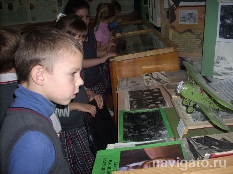 Наши первые маленькие посетители 1«а» и 5«а» классов внимательно слушали рассказ об этом удивительном человеке, рассматривали экспонаты, которые подарил Василий Васильевич (фронтовая рубашка, летные карты, почетные грамоты и удостоверения к наградным документам, фотографии). В далеком 1979 году сами ученики на занятиях авиамодельного кружка изготовили макет самолета У-2, на котором он летал.