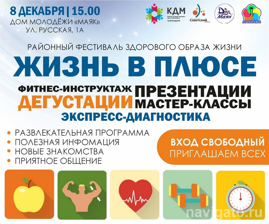 Фестиваль здоровья под таким названием пройдёт в Доме молодёжи «Маяк» (ул. Русская, 1а) 8 декабря. В программе фитнес-инструктаж, презентации косметических процедур, мастер-классы и консультации по правильному питанию, экспресс-диагностика индивидуальных особенностей. Гостей ждут интерактивные площадки и выступления творческих и спортивных коллективов. Начало в 15 часов. Вход свободный.