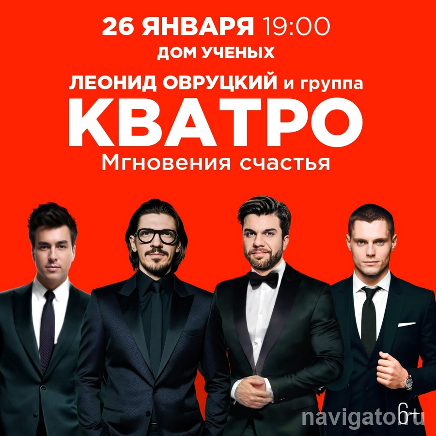 Жителей и гостей Советского района приглашают на концерт Леонида Овруцкого и группы «Кватро». Концертную деятельность коллектив ведёт уже более 20 лет.