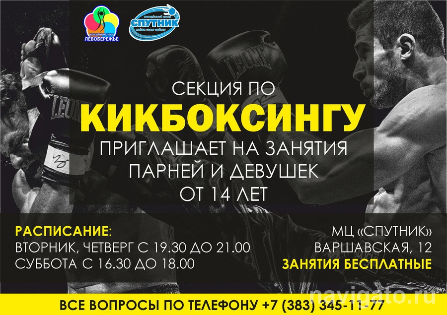 Парней и девушек от 14 лет приглашают в секцию по кикбоксингу. Бесплатные занятия проходят в МЦ «Спутник» (ул. Варшавская, 12) во вторник и четверг с 19.30 до 21.00, в субботу с 16.30 до 18.00.