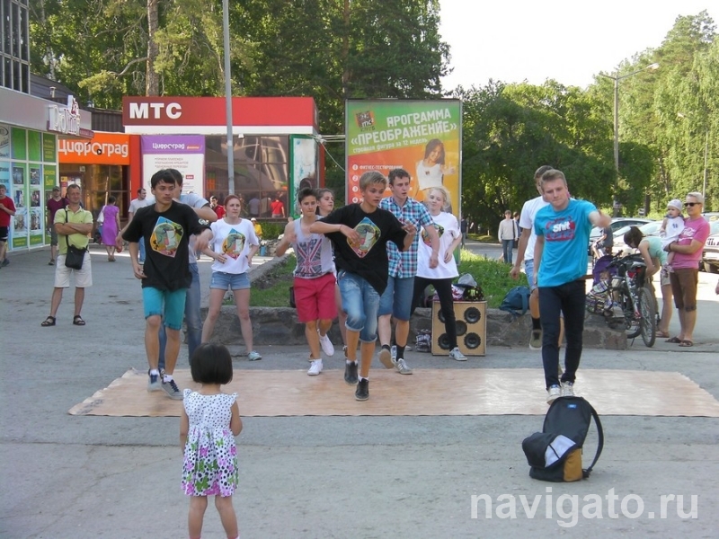 На большом экране транслировалось происходящее на импровизированной сцене, поэтому смотреть представление можно было с любого места. Большинство зрителей устроились на зеленом пригорке напротив ДК «Академия». Выступающие порадовали зрителей средневековыми историческими танцами, хип-хопом, самбой. Фитнес-клуб «RеFорма» представил испанский танец с шалями, а выступление маленьких артистов студии «Вираж» встретили самыми бурными аплодисментами.