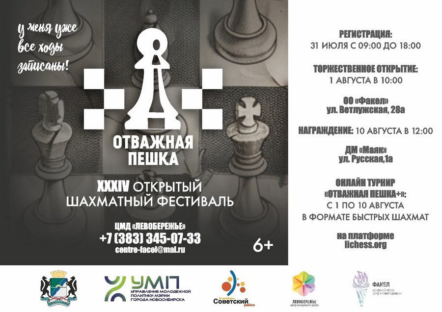 Место проведения офлайн-турниров – молодёжный центр «Левобережье», основной отдел «Факел», ул. Ветлужская, 28а. Регистрация участников состоится 31 июля с 09.00 до 18.00. Торжественное открытие «Отважной пешки» – 1 августа в 10.00. Закрытие фестиваля проведут в Доме молодежи «Маяк» (ул. Русская, 1а) 10 августа в 12.00.