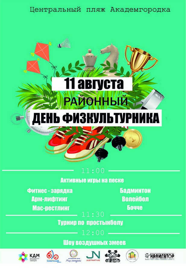 В это же время начнётся и районное спортивное мероприятие на Правом берегу – на Центральном пляже Академгородка. Программа от МЦ «Мир молодёжи» намечается обширная: соревнования по силовым видам спорта – армлифтингу, мас-рестлингу, турниры по пляжному волейболу и простынболу, шоу воздушных змеев и многое другое.