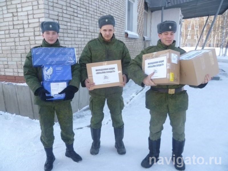 Примерное содержание посылок: продукты – сгущёнка, конфеты, печенье (упакованное); бритвенные принадлежности (крем/пена для бритья, одноразовые бритвенные станки); мыло туалетное, зубные щётки, паста; шариковые/твёрдые дезодоранты (не содержащие спирта); конверты, тетради, ручки, блокноты, календари.