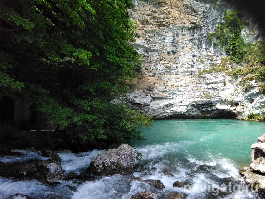 Недалеко от места нашего пребывания на берегу моря расположены Белые скалы. Базальтовые породы почти идеально белого цвета с причудливыми узорами, протяжённостью около 200 метров, практически упираются в море. Говорят, что именно здесь снималась знаменитая сцена рыбалки из фильма «Бриллиантовая рука». Полюбовавшись красивым пейзажем, отправляемся дальше, вдоль берега, мимо обветшалой (но действующей!) железнодорожной станции. Видим, как в Чёрное море впадает горная река Хашупсе, сталкиваясь с морскими волнами и образуя стремительные водовороты.