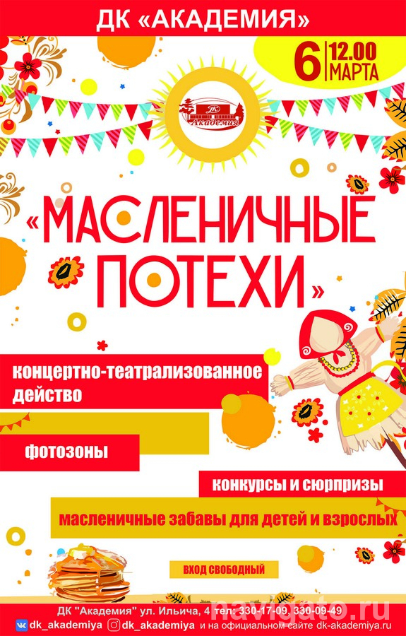 6 марта в 12 часов на сцене ДК «Академия» состоится яркое театрализованное представление. Вас ждут весёлые скоморохи, задиристая Коза, шутник Петрушка и, конечно, Масленичный Блин! Они придут с играми да забавами на потеху публике. Зрителей, несомненно, порадуют номера в исполнении ансамбля «Я танцую!». В фойе ДК – интерактивные площадки и фотозоны, горячие блины «с пылу с жару». Вход свободный.
