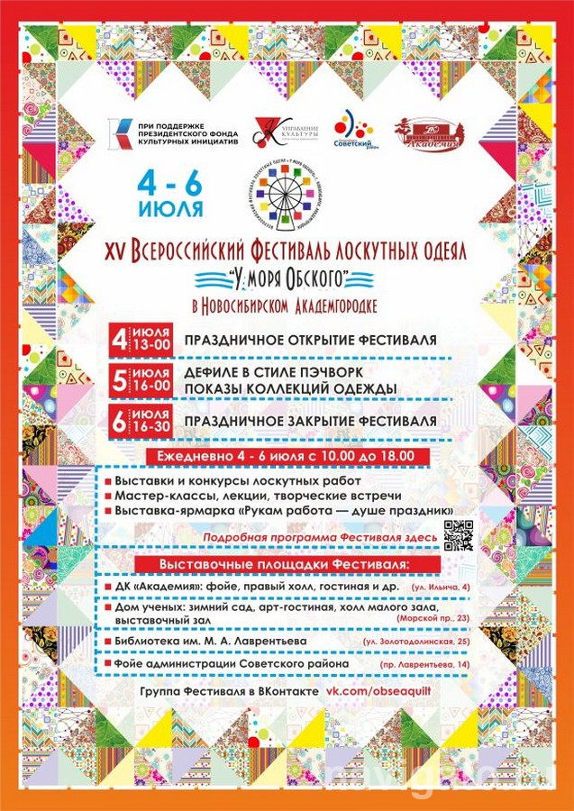 Открытие XV Всероссийского фестиваля лоскутных одеял «У моря Обского» состоится в пятницу 4 июля в 13:00 на площади ДК «Академия» (ул. Ильича, 4).