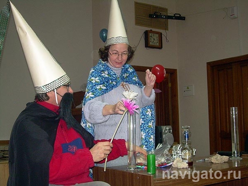 Несомненно, вечеринка, посвященная такому великому дню, не могла обойтись без соответствующих развлечений. Популярный нынче в научной среде юмористический конкурс антинаучных инновационных проектов предстал здесь в несколько неожиданном виде. Так, выступить членами жюри пригласили студенток третьего курса гуманитарного факультета НГУ! Девушки в маскарадных костюмах внимательно выслушали доклады о влиянии спирта на клетки крови человека и о будущем кремнийорганических технологий, поучаствовали в «путешествии» к Вольтеру и наблюдали за физико-химическими фокусами. Вердикт гуманитариев однозначен: в жизни должно быть место чудесам, поэтому победа досталась Иннокентию Колдующему и Нинон Всевидящей.