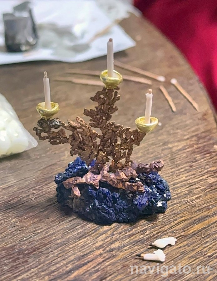 По итогам множества экспериментов выяснилось, что определяющий фактор – соотношение диаметра фитиля и самой свечи. Если воска много, то свечка тухнет. Если мало, то получается не свечка, а палочка, обмазанная воском. Владимир установил, что оптимальный диаметр фитиля 0,5-0,7 мм, диаметр свечи 2-2,2 мм, длина свечи 10 мм. А ещё сделал канделябр с тремя позолоченными сусальным золотом чашечками. На кусочке азурита закрепил самородок меди, ещё один самородок поместил для красоты.