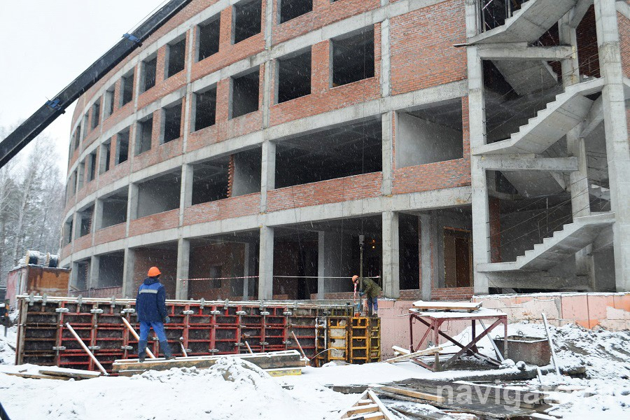 Ни снег, ни дождь, ни ветер не останавливают работы. Техника и люди постоянно в движении. Уже почти готов каркас, возведены четыре этажа, хотя к очистке территории приступили лишь в апреле, а в августе торжественно заложили первый камень.
