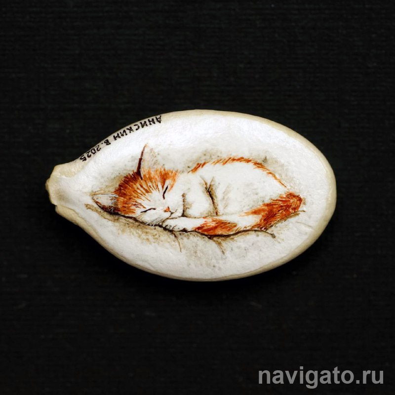 – Последние несколько недель я рисовал на тыквенных семечках. С большим удовольствием. Они достаточно большие, и поэтому сложностей у меня не вызывали, – делится впечатлениями автор.