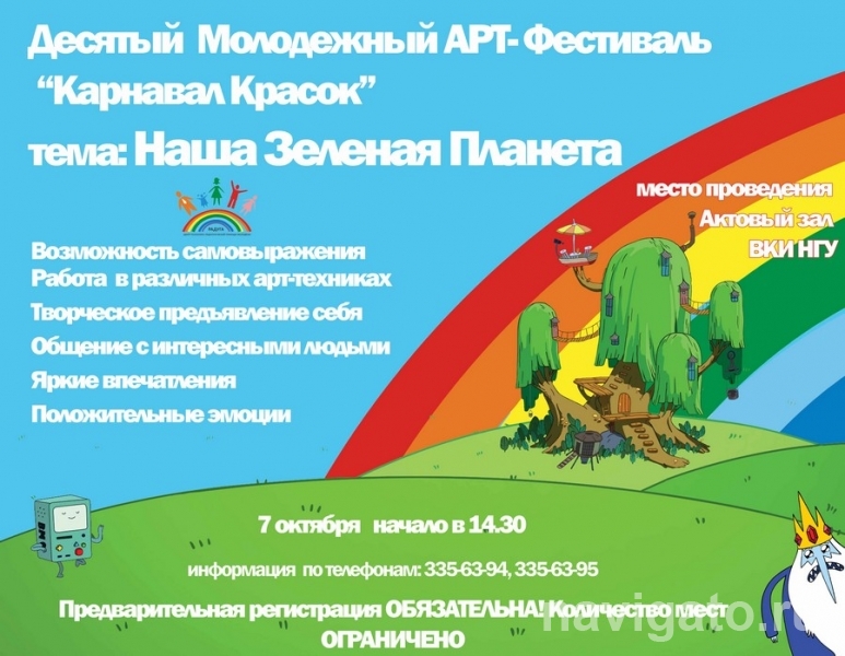Такова тема X молодёжного арт-фестиваля «Карнавал красок», организованного центром «Радуга». Он пройдёт 7 октября в ВКИ НГУ (ул. Русская, 35), начало в 14.30. Гостей ждут мастер-классы, экспресс-диагностика личности, выступление музыкальных групп, новые знакомства. Количество мест ограничено, предварительная регистрация обязательна. Телефоны 335-63-94, 335-63-95.