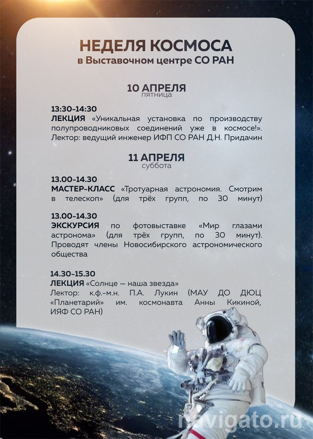10 и 11 апреля все желающие могут побывать на Неделе космоса в Выставочном центре СО РАН (ул. Золотодолинская, 11, вход №2). В программе – лекции, экскурсии по выставке «Глазами астронома», мастер-класс «Тротуарная астрономия. Смотрим в телескоп». Телефон для справок 238-36-96.