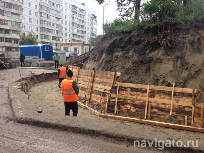 К началу осени все подготовительные работы по укреплению подпорной стены были проведены. С 11 сентября началась реконструкция. Тяжелая строительная техника разрушила стену и срезает верхний слой почвы.