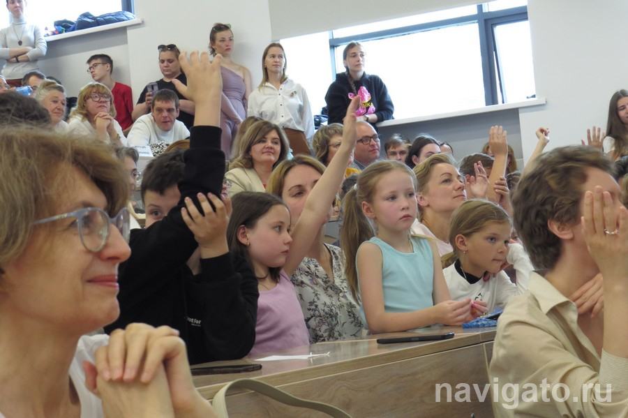 Вначале на большой экран вывели видео от «Роскосмоса» об Анне, её работе и успехах. Далее всё проходило в формате «вопрос-ответ». Многие сразу подняли руки и ждали своей очереди. Вопросы были интересными, а ответы – понятными, иногда с долей шутки.