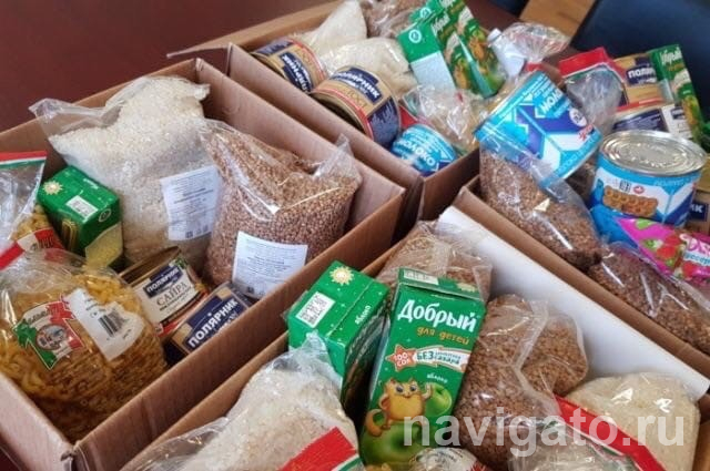 По информации Натальи Пинус, в набор входят макаронные изделия, мука, крупы, подсолнечное масло, консервы, кондитерские изделия, чай, сахарный песок и сгущенное молоко. Скоро наборы начнут поступать в Новосибирск, они будут приходить партиями, по 3000-4000 штук в месяц.